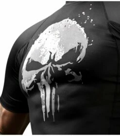 The Punisher Short Sleeve Rash Guard is built with the same quality, construction, and materials as the Hayabusa Rash Guard. It will protect you from the mat, help with thermal regulation and last through your toughest workouts. The dark rugged design is accompanied by Frank’s signature warning to all who oppose him, The Punisher skull.